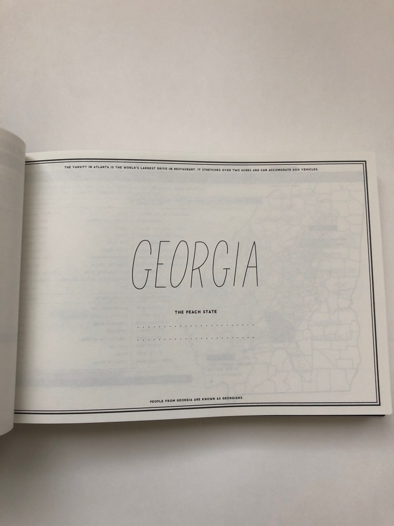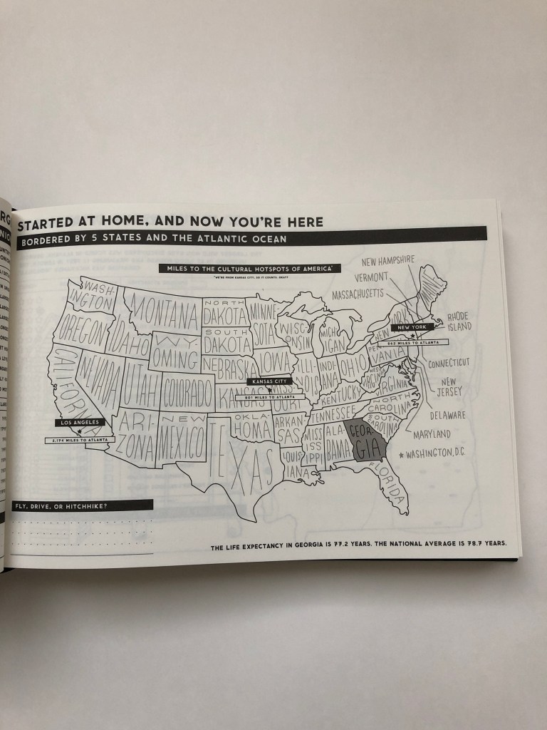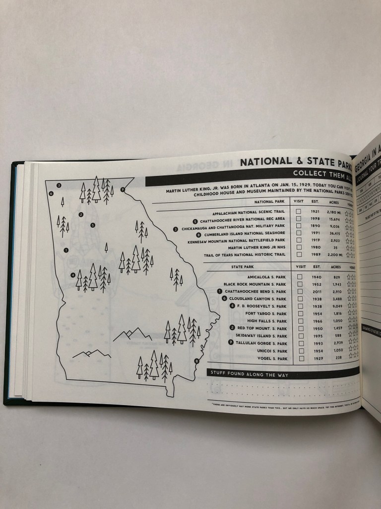 I stumbled upon an amazingly perfect camping / travel journal and travel guide. The pages are filled with parks, landmarks, interesting places, note and sketch areas to document the details of all of the who, what, when. This travel guide is not only for campers but for those that want to spend moments making memorable, fun and quirky experiences while traveling the 50 states.