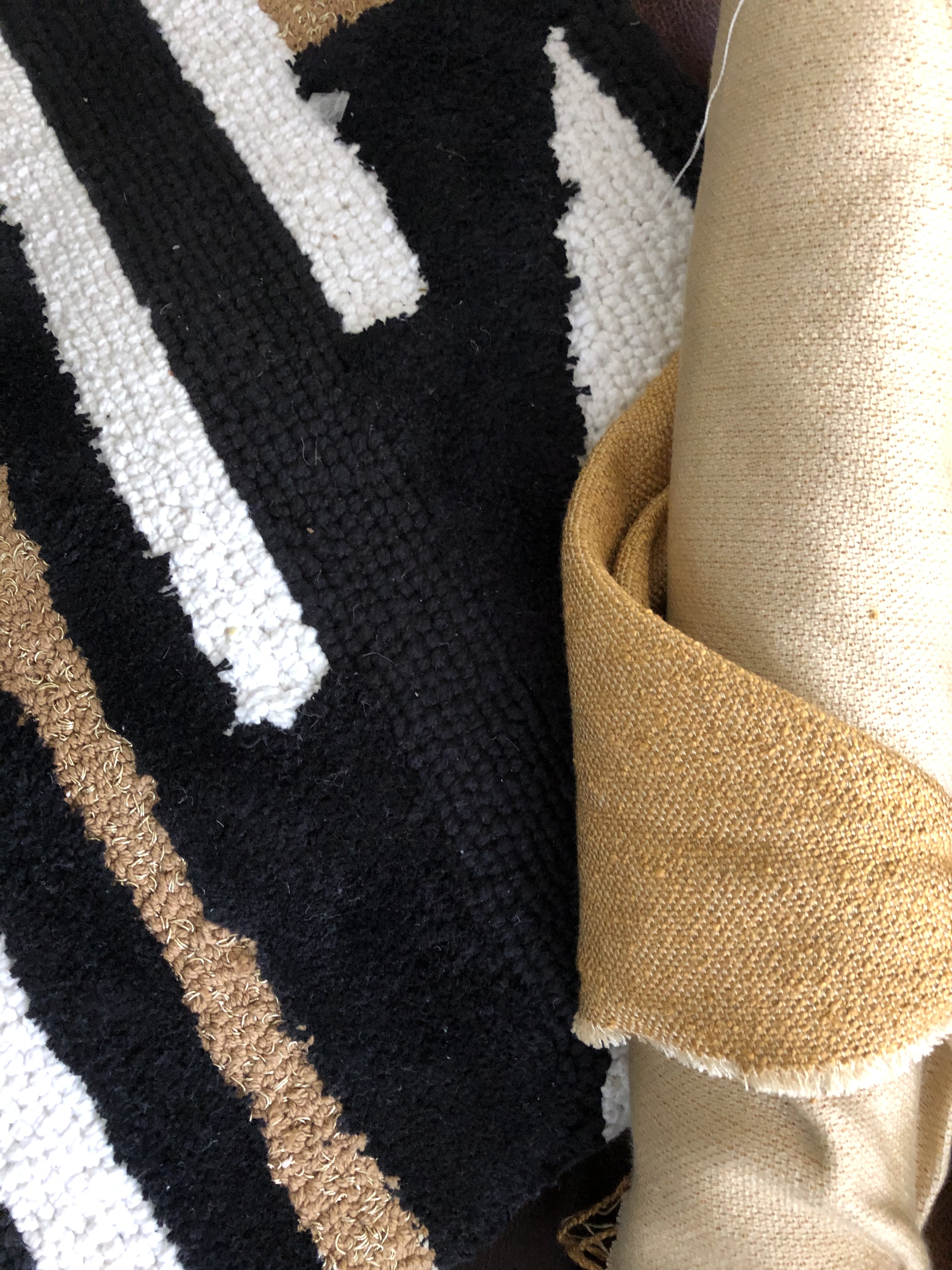 The rugs include a geometric black, gold, and white patterns which brings a striking contrast to the interior.