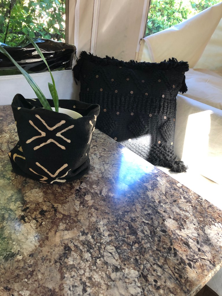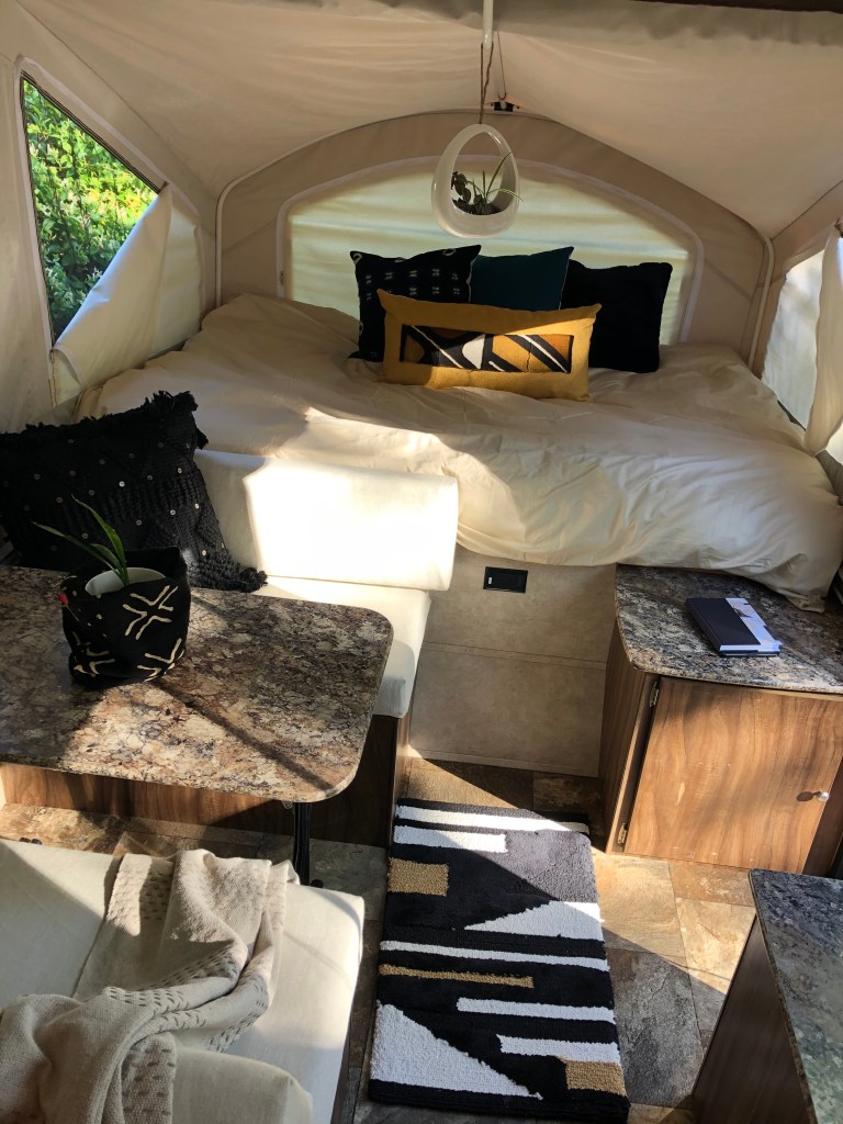 The tent camper interior design is what I could classify as “glamp chic” which includes down feather comforters, bamboo cutting boards, African mud cloth, custom designed pillow covers, down throw pillows, 400 count cotton duvets, cotton sheets, cotton rugs, cotton throw, candles, hanging planters, live plants, and an embellished throw pillow.